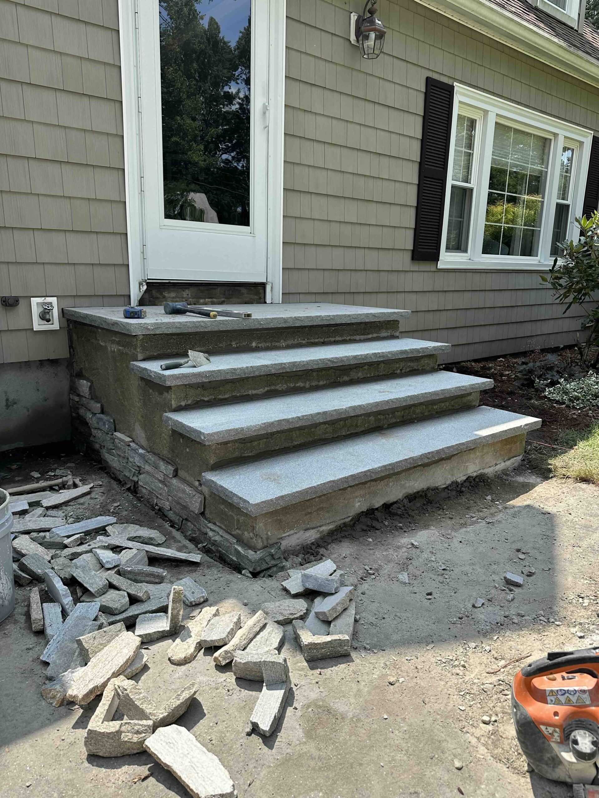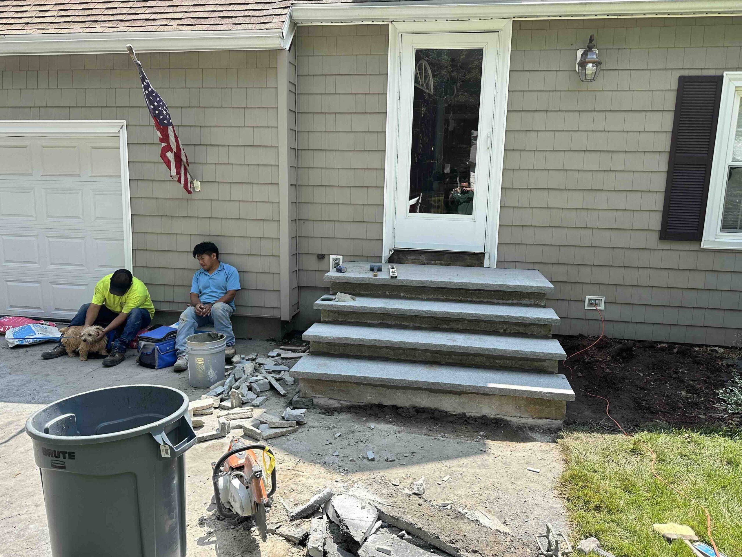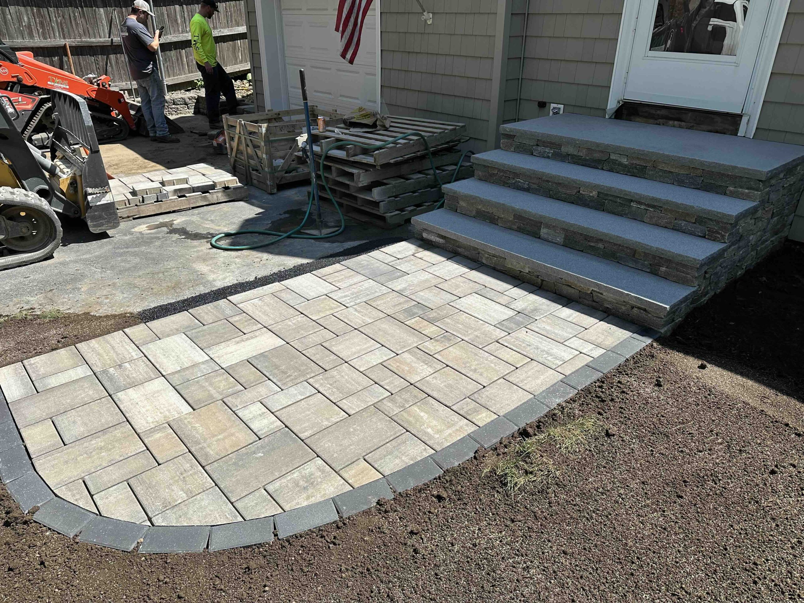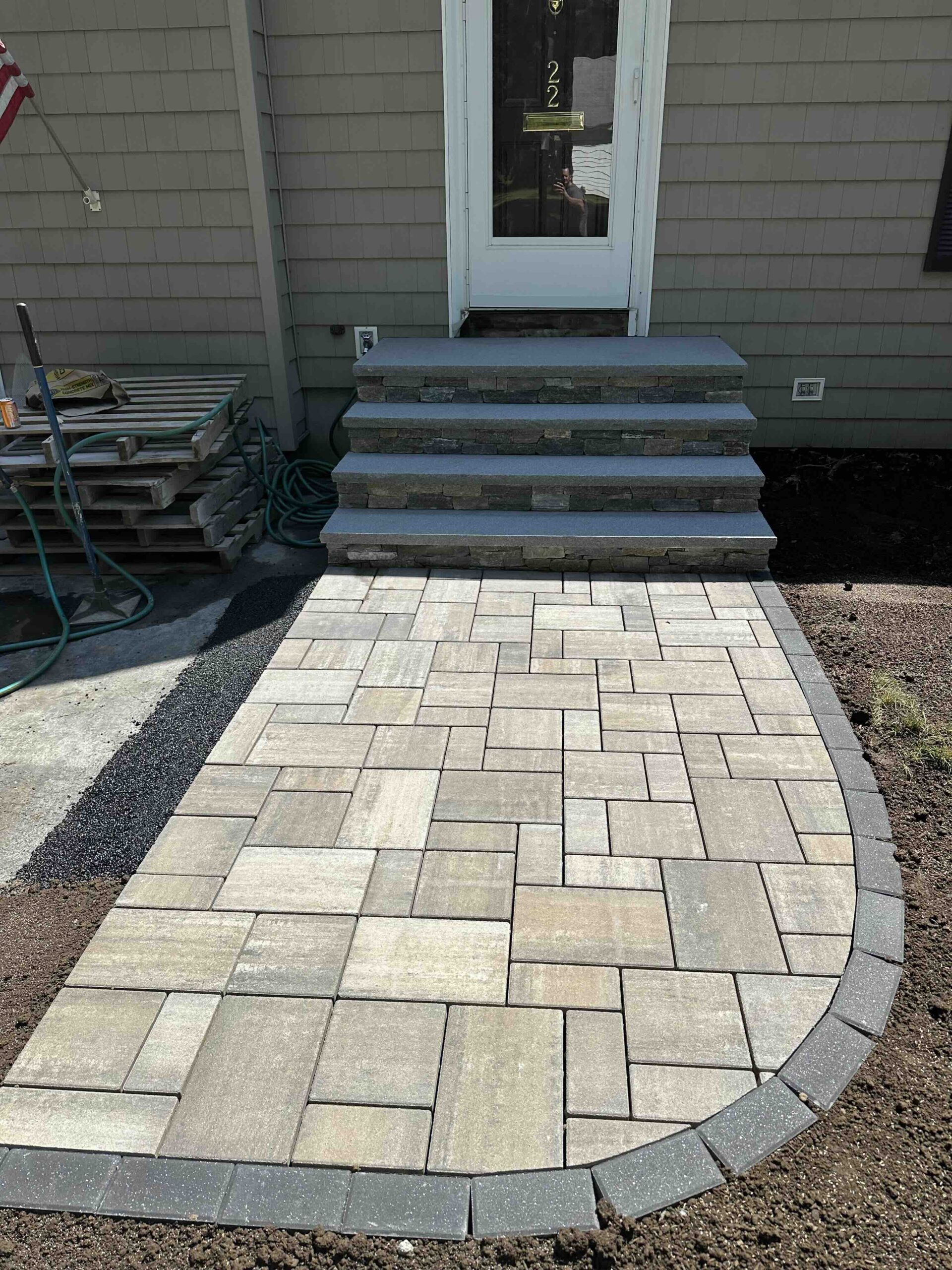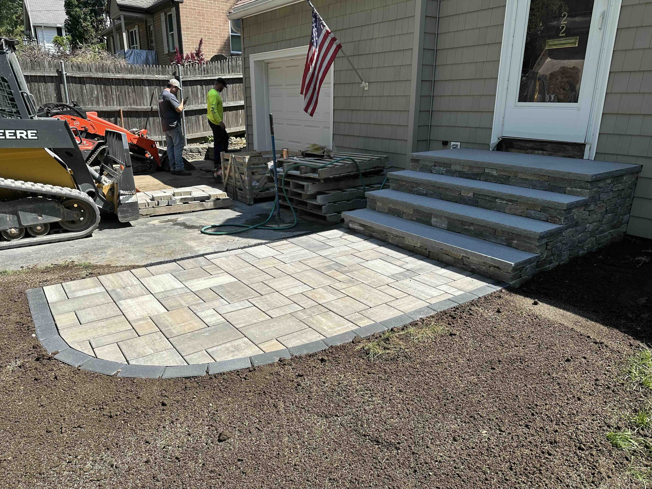 This project was completed in Worcester, Ma in summer 2024. As part of this project we installed a 450 sq. ft. patio in the backyard and a 54 sq. ft. front landing/walkway with thin stone veneered step facelift.