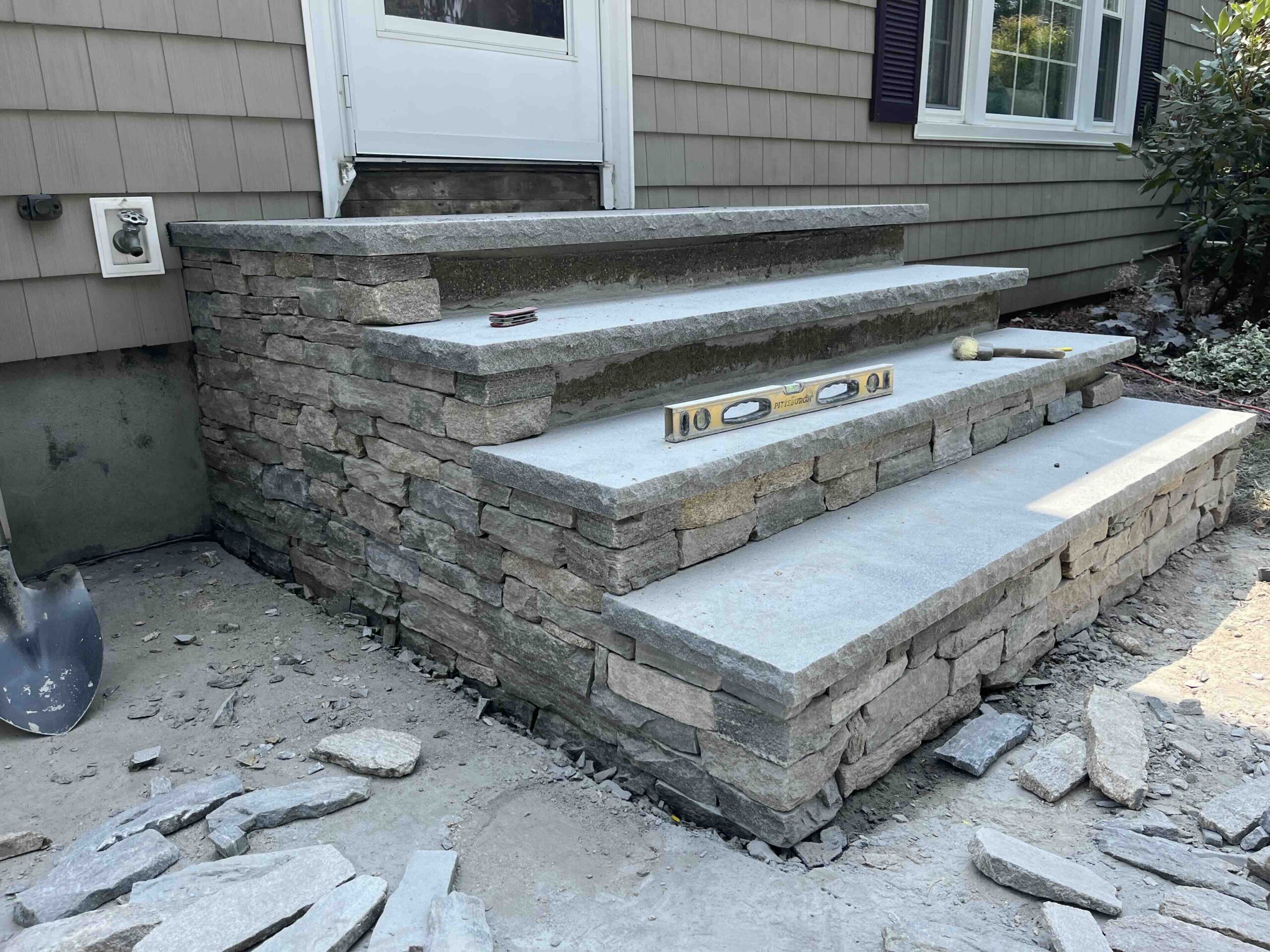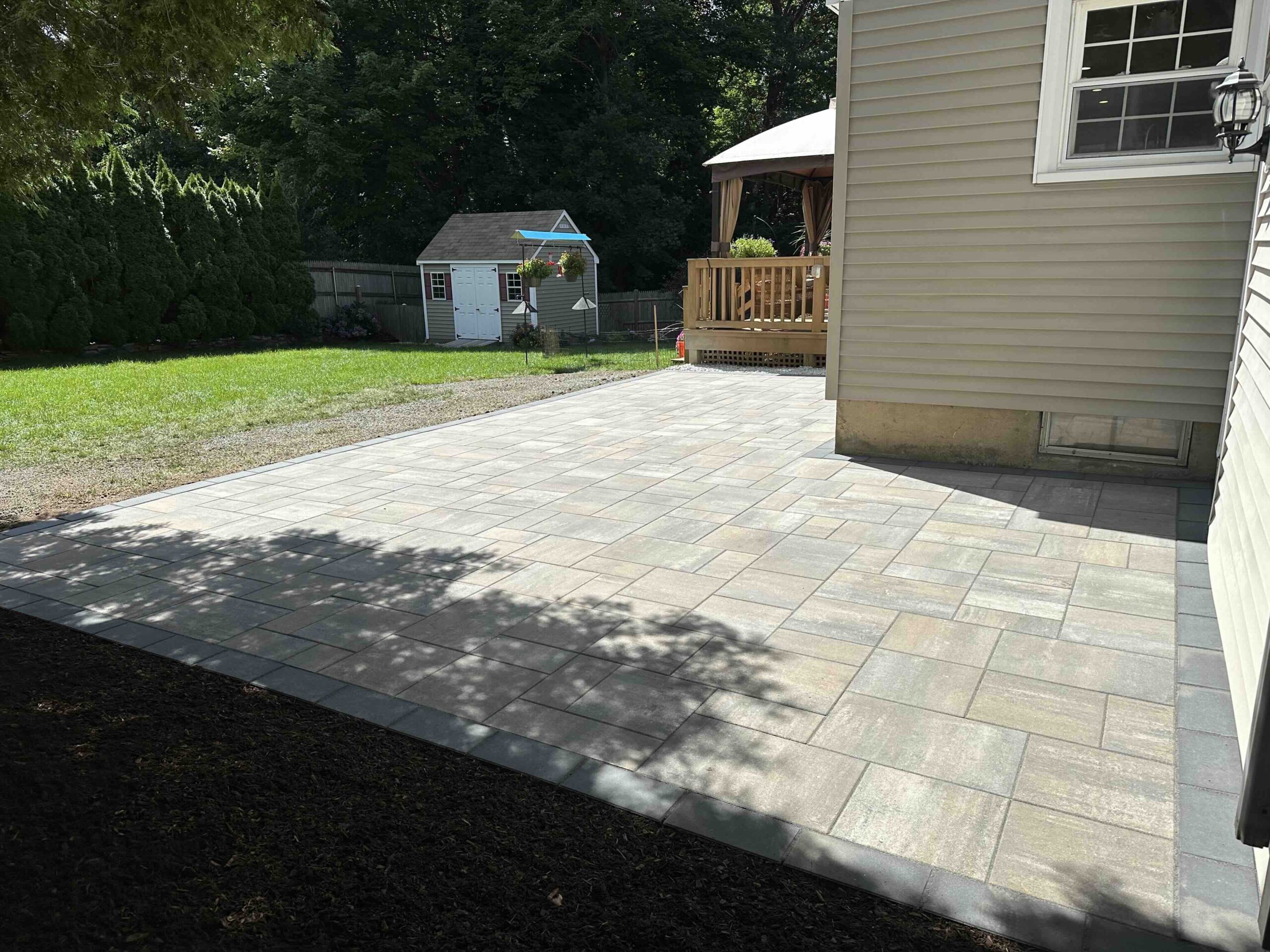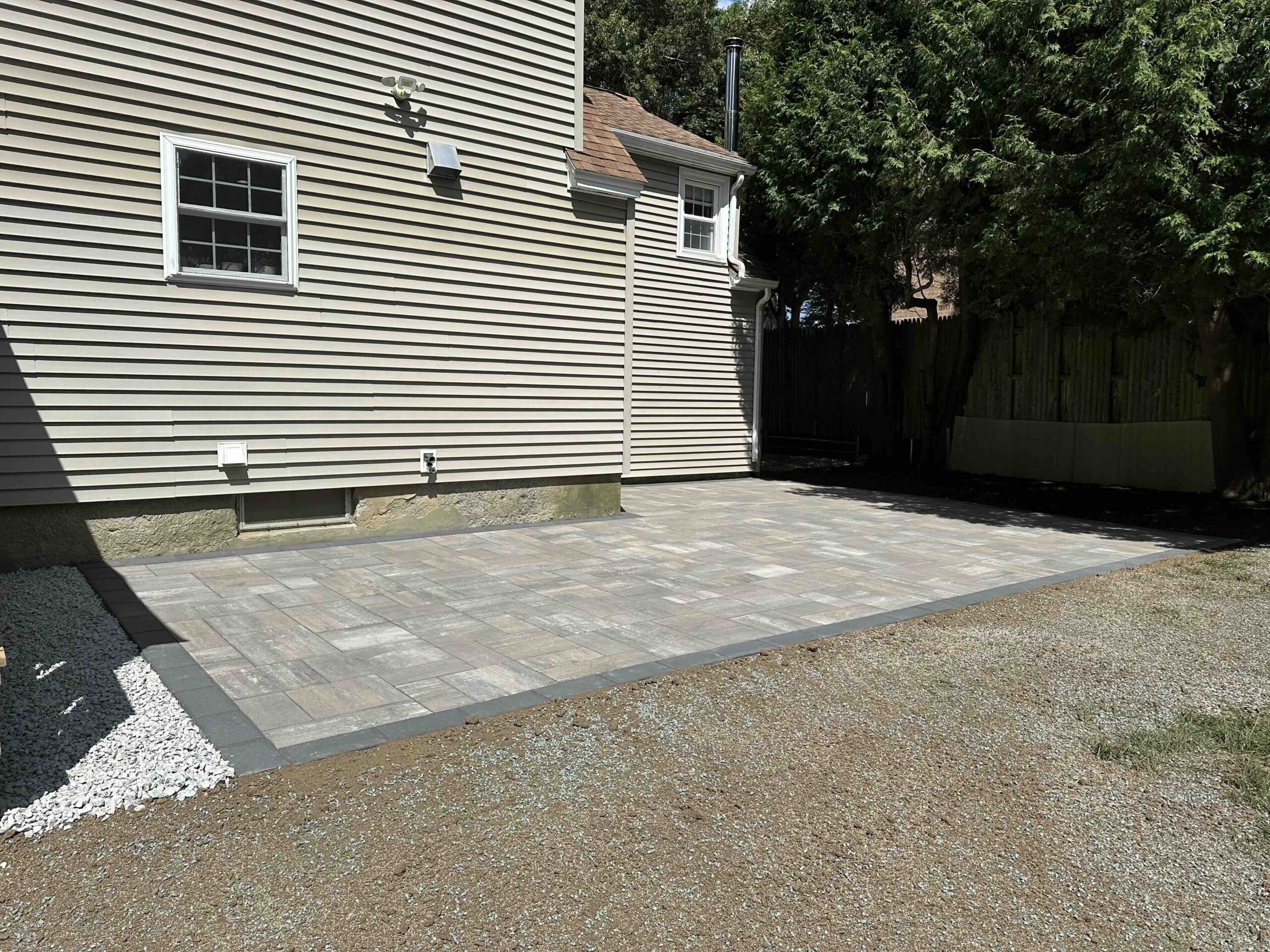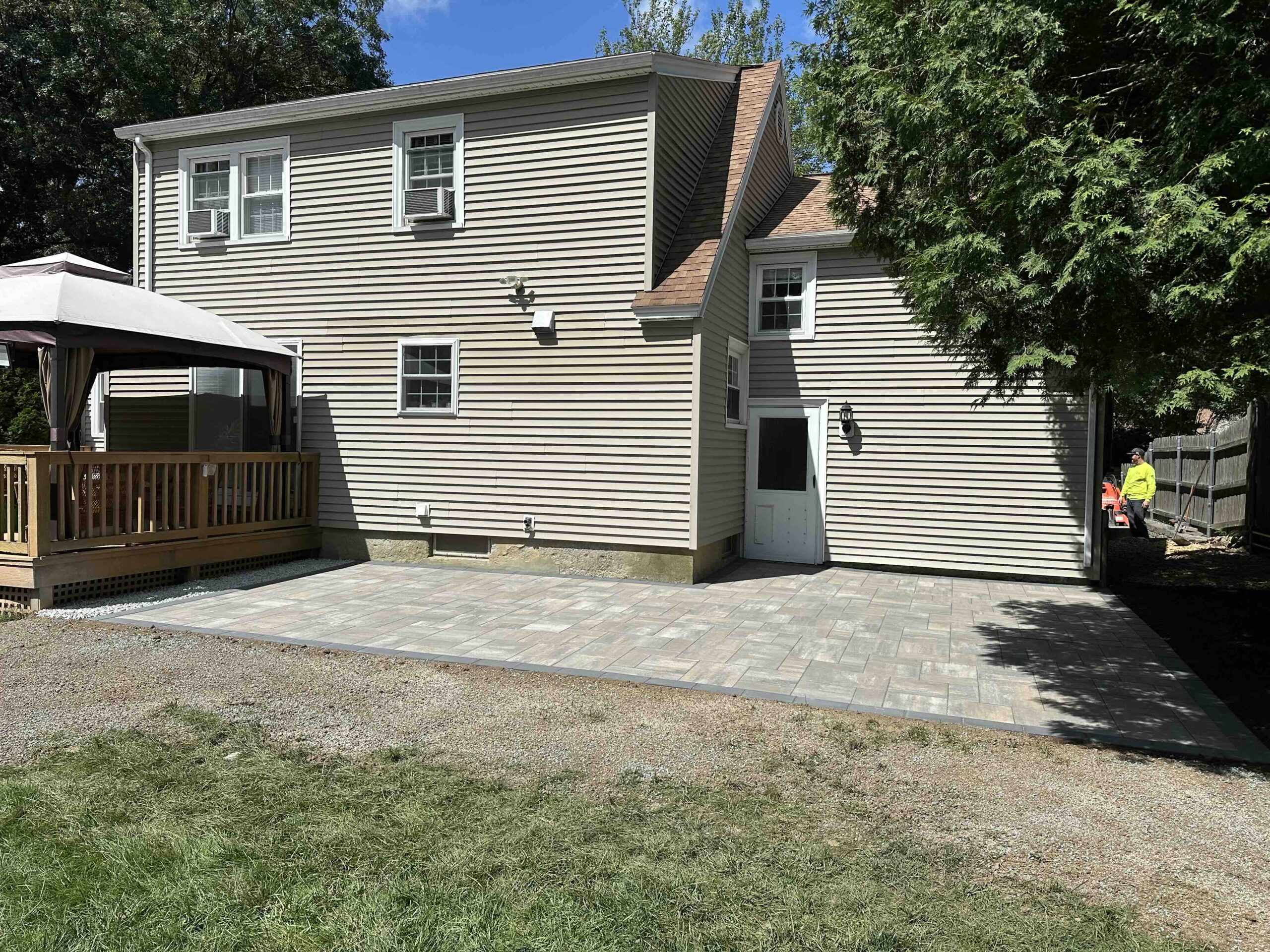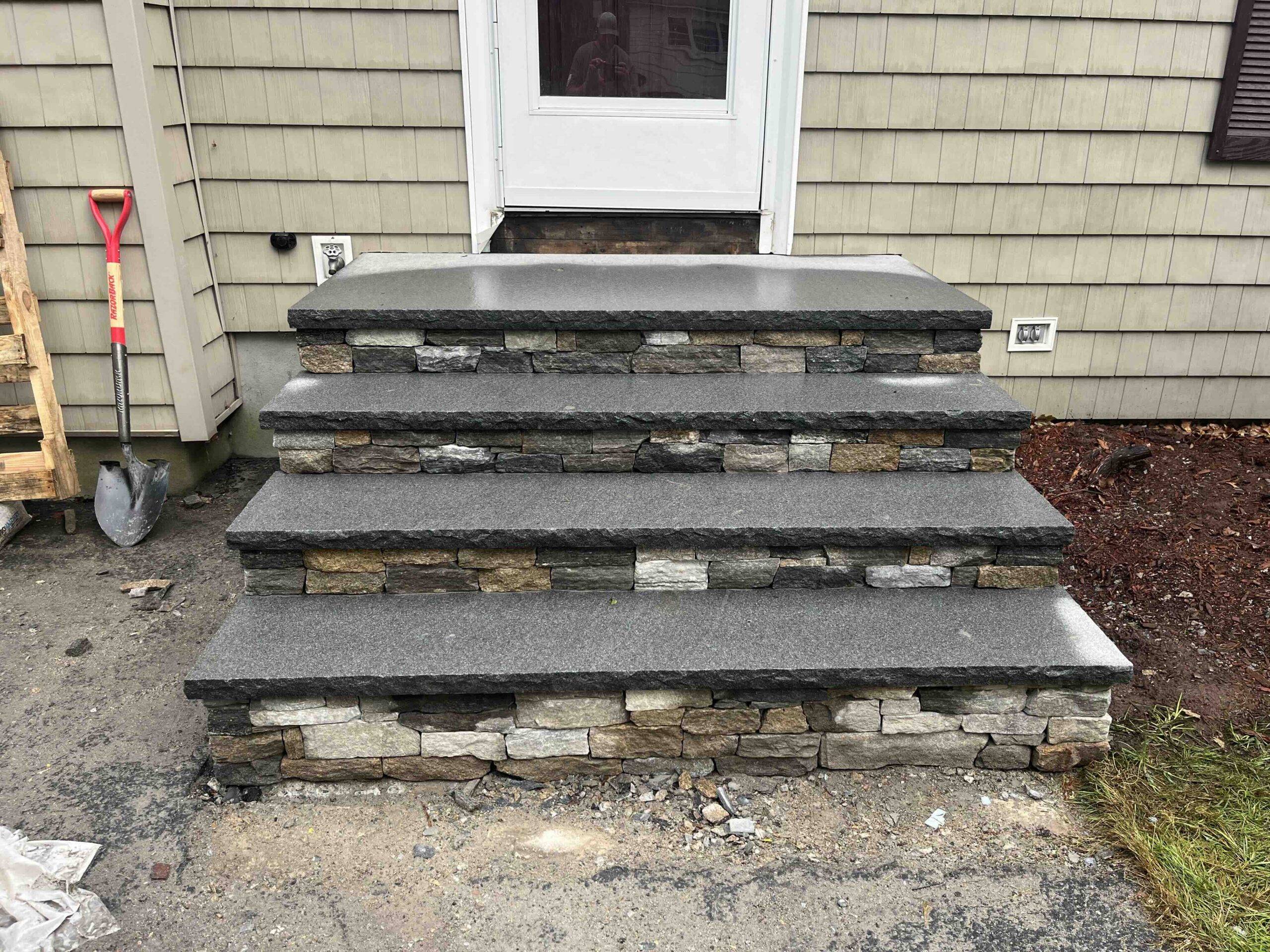 This project was completed in Worcester, Ma in summer 2024. As part of this project we installed a 450 sq. ft. patio in the backyard and a 54 sq. ft. front landing/walkway with thin stone veneered step facelift.