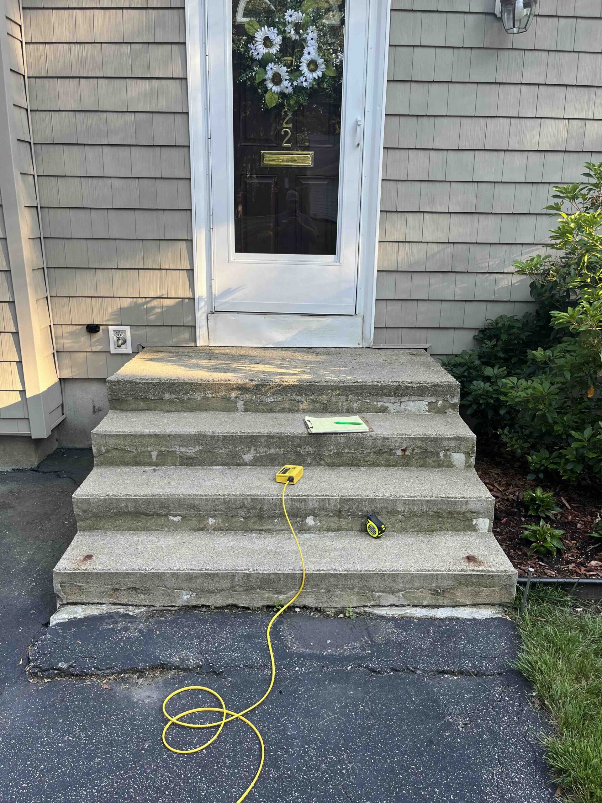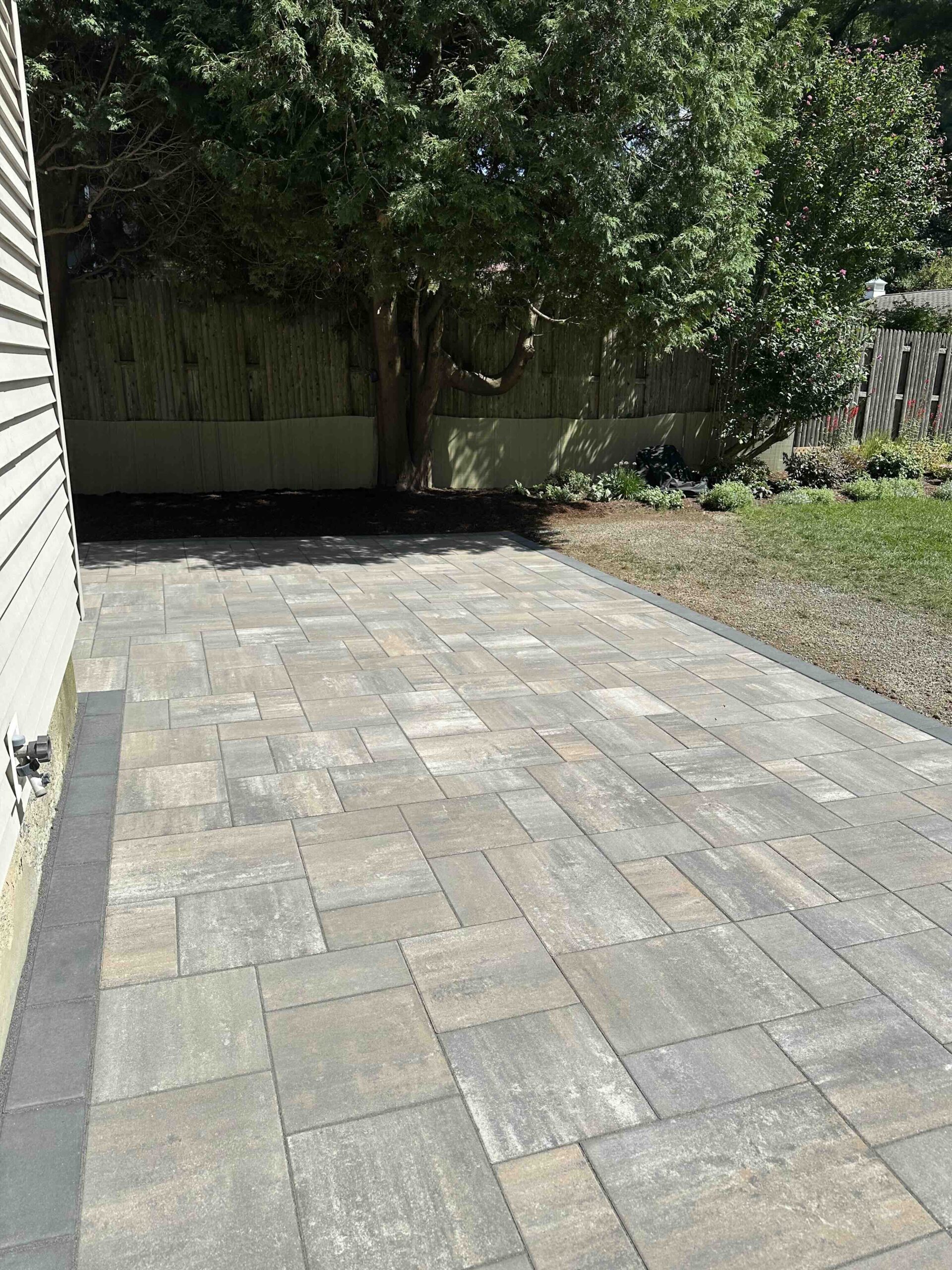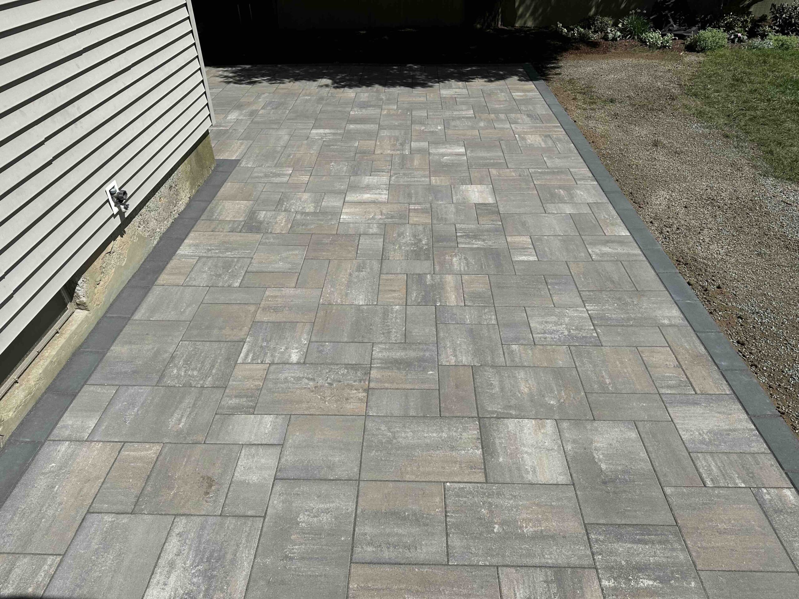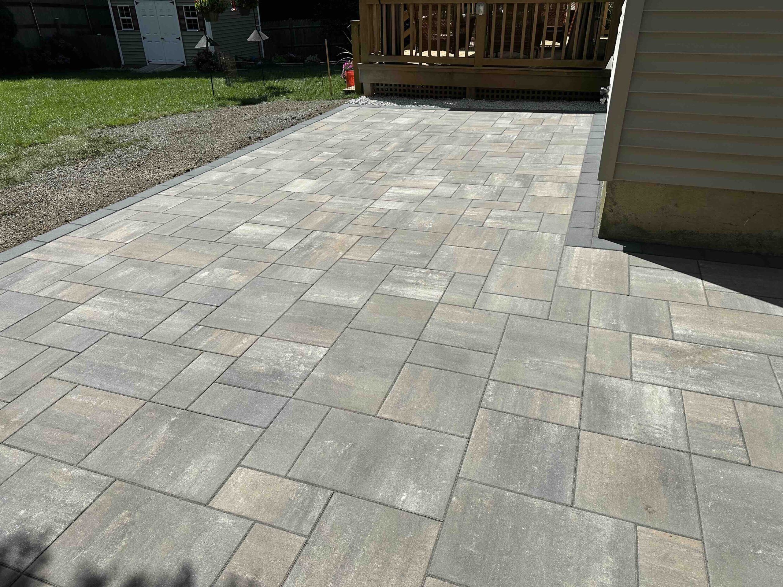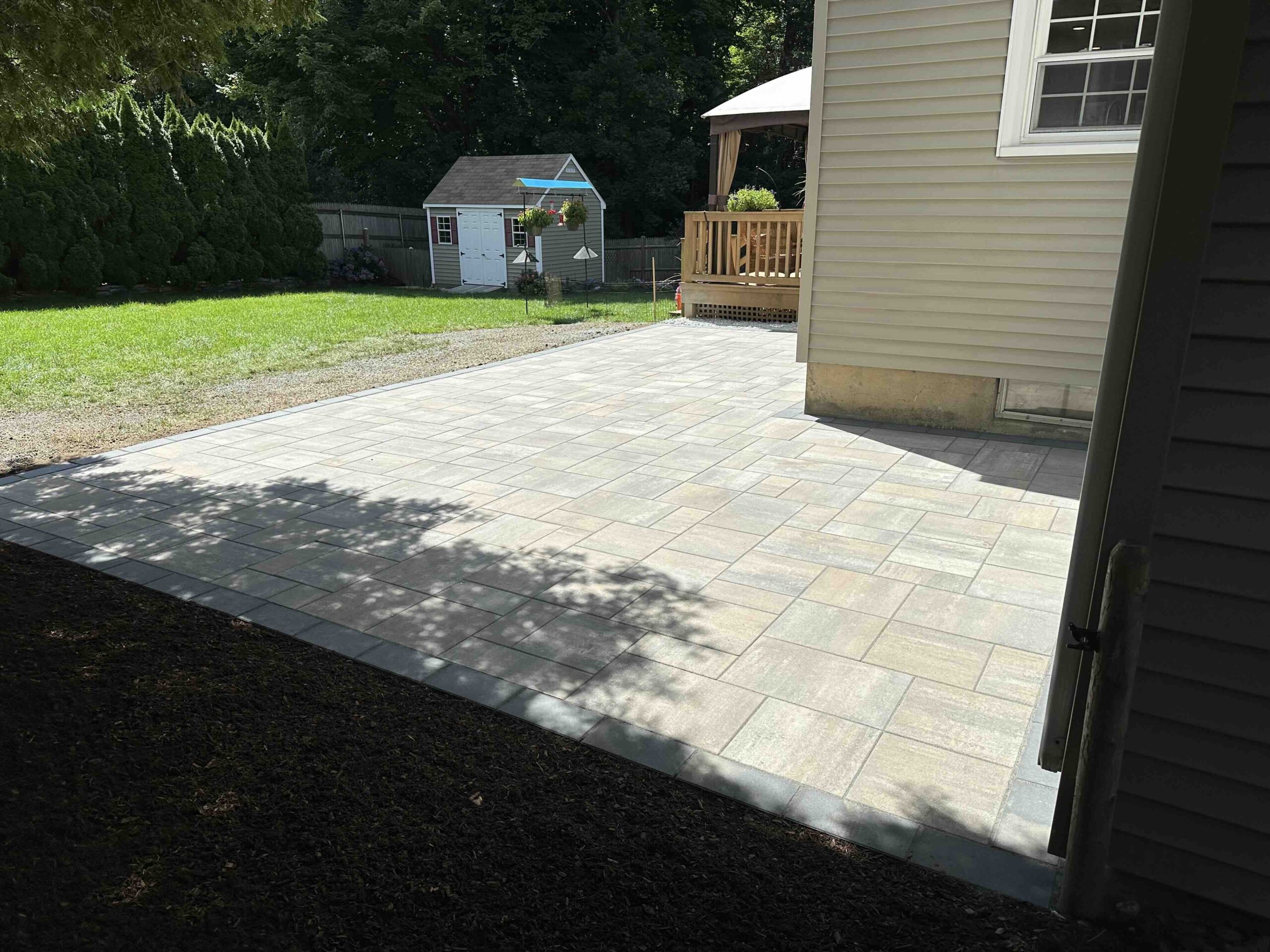 This project was completed in Worcester, Ma in summer 2024. As part of this project we installed a 450 sq. ft. patio in the backyard and a 54 sq. ft. front landing/walkway with thin stone veneered step facelift.